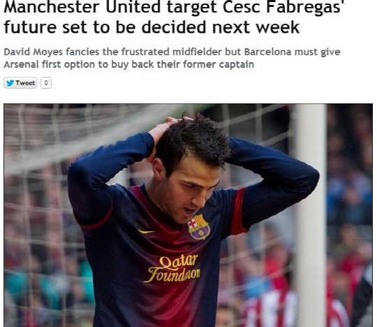 31일(한국시각) 영국 일간지 데일리미러에 따르면 파브레가스는 이번주 시즌이 끝나면 티토 비야노바 감독과 면담을 할 예정이다. 이 자리에서 바르셀로나 잔류 여부에 대해 결정이 날 것으로 보인다. 파브레가스는 많은 관심속에 아스널을 떠나 바르셀로나로 컴백했다. 그러나 바르셀로나의 막강 미드필드진에 막혀 최전방 공격수로 뛰더니, 최근에는 중요한 경기마다 선발 명단에 이름을 올리지 못하는 굴욕을 당하고 있다. 파브레가스는 이에 강한 불만을 품고 있는 것으로 알려졌다.