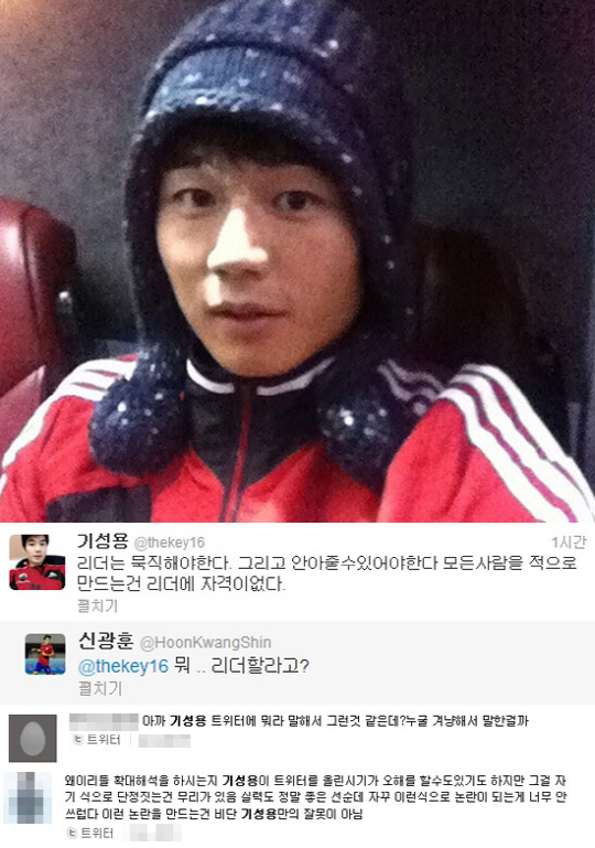 또 기성용의 글에 현재 국가대표팀 소속으로 레바논에서 훈련하고 있는 신광훈(26, 포항스틸러스)은 "뭐...리더 하려고?"라는 답변을 남겨 눈길을 끌고 있다.