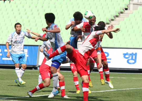 5일 대구스타디움에서 대구와 부산의 K-리그 클래식 10라운드 경기가 열렸다. 부산 골문 앞에서 양 팀 선수들이 몸싸움을 펼치고 있다. 사진제공=대구FC
