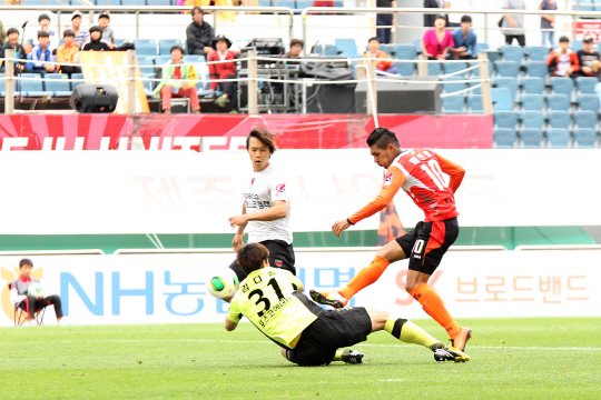 | ◇포항 골키퍼 김다솔이 1일 제주월드컵경기장에서 열린 제주와의 2013년 K-리그 클래식 경기에서 페드로의 슛을 막아내고 있다. 사진제공=제주 유나이티드 |