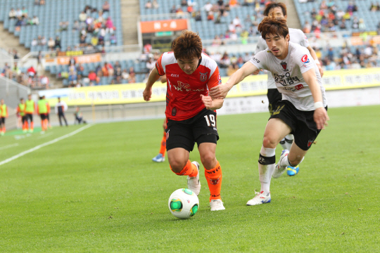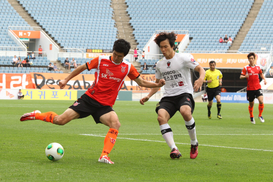 1일 제주월드컵경기장에서 열린 제주-포항 전은 패스축구의 맞대결로 관심을 끈 경기였다. 제주 배일환(왼쪽)이 포항 조찬호의 마크를 뚫고 드리블 하고 있다. 사진제공=제주 유나이티드