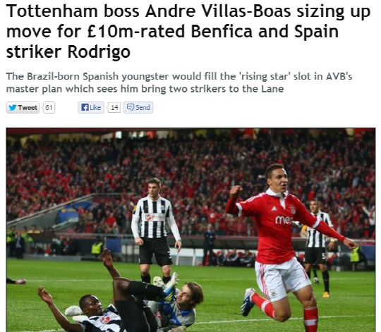 3일(한국시각) 영국 일간지 데일리미러는 토트넘이 벤피카의 공격수 호드리고에 관심을 보이고 있다고 보도했다. 스페인 21세 이하 대표팀 공격수이기도 한 호드리고는 올시즌 맹활약을 펼치며 토트넘의 관심을 끌었다. 브라질에서 태어난 호드리고는 스페인으로 적을 옮긴 후 스페인 국적을 획득했다. 레알 마드리드에서 선수생활을 시작한 호드리고는 한때 볼턴에서 임대 선수로 뛰기도 했다. 포르투갈 벤피카 이적 후 잠재력을 터뜨리며 본인의 가치를 끌어올리고 있다. 호드리고의 이적료는 1000만파운드로 평가받는다.