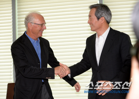 베켄바워 회장은 3일 서울 신문로 아산정책연구원에서 정몽준 대한축구협회 명예회장과 함께 기자회견을 가졌다. 그는 1974년 서독월드컵에서는 선수로, 1990년 이탈리아월드컵에서는 독일대표팀의 감독으로 우승을 차지한 독일 축구의 간판이다. '카이저(황제)'라는 별명이 그의 위상이다. 2006년 독일월드컵 유치위원장과 조직위원장을 역임한 그는 2012~2013시즌 트레블(유럽챔피언스리그, 정규리그, FA컵 동시 석권)을 달성한 세계 최고의 명문구단 바이에른 뮌헨의 명예회장을 맡고 있다.