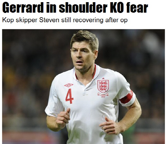 제라드는 시즌 내내 어깨부상으로 고생했다. 결국 시즌이 끝나기전 수술대에 올랐다. 최근 진행한 아일랜드와 브라질과의 친선경기에서도 나서지 못했다. 리버풀의 프리시즌에 맞춰 재활을 진행 중이던 제라드는 나이 때문인지 예상 속도보다 더 딘 회복속도를 보이고 있다. 잉글랜드 대표팀과 리버풀 모두 아쉬운 소식이 아닐 수 없다.