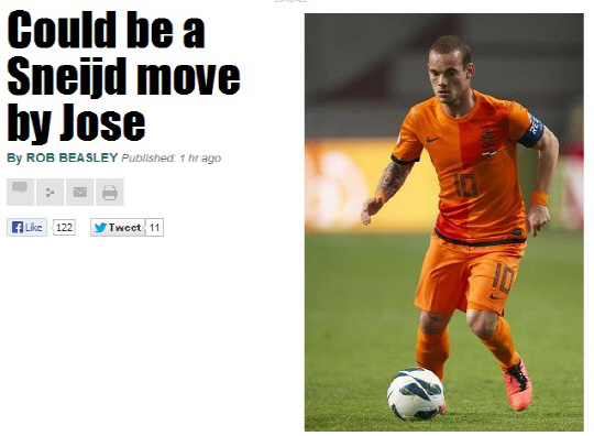 4일(한국시각) 영국 일간지 더선은 최근 갈라타사라이에서 힘든 시간을 보내고 있는 스네이더르가 첼시행을 원하고 있다고 보도했다. 스네이더르는 파티흐 테림 감독과 불화를 겪고 있으며, 갈라타사라이 역시 적절한 제안이 들어온다면 스네이더르를 팔 수 있다는 입장이다. 스네이더르는 인터밀란에서 자신의 최전성기를 함께 한 무리뉴 감독과의 재회를 원하고 있다. 무리뉴 감독은 팀 재편작업에 나섰으며, 이적료만 맞는다면 여전히 쓸만한 중앙 미드필더인 스네이더르를 영입할 가능성도 적지 않다.