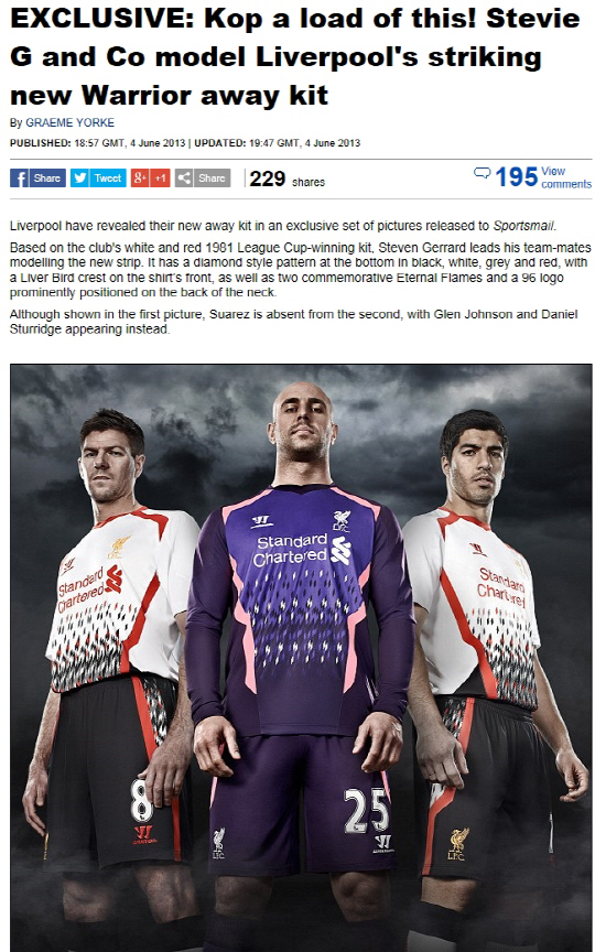 유럽 빅클럽들로부터 러브콜을 받고 있는 수아레스도 새시즌 유니폼을 입고 등장했다. 첫 번째 사진에는 스티븐 제라드, 페페 레이나 골키퍼와 함께 모델로 나섰다. 그런데 두 번째 사진에는 모델이 바뀌었다. 제라드와 레이나는 그대로지만, 수아레스가 없었다. 대신 글렌 존슨과 다니엘 스터리지가 모델이 됐다.