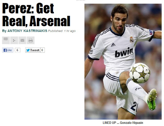 11일(한국시각) 영국 일간지 더선은 아스널과 유벤투스가 이과인을 노리고 있다고 보도했다. 아스널은 이미 레알 마드리드와 협상을 시작했다. 아르센 벵거 아스널 감독은 이과인의 에이전트를 만나 1900만파운드의 이적료와 15만파운드의 주급을 제시했다. 그러나 이적료에서 이견을 보였다. 레알 마드리드는 이적료로 3000만파운드 정도를 원하는 것으로 알려졌다. 레알 마드리드의 플로렌티노 페레스 회장은 "2500만파운드로는 어림도 없다"고 으름장을 놨다. 유벤투스도 상황을 주시 중이다. 유벤투스는 유럽챔피언스리그에서 좋은 성적을 거두기 위해 월드클래스 공격수 보강을 원하고 있다. 유벤투스는 페레스 회장을 이탈리아의 한 레스토랑에서 만난 것으로 알려졌다.