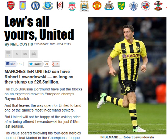 영국 일간지 더 선은 11일(한국시각) '맨유가 레반도프스키의 영입을 위해 이적료 2550만파운드(약449억원)을 준비했다'고 밝혔다. 도르트문트는 지난 10일 레반도프스키의 바이에른 뮌헨 이적 불가를 선언했다. 레반도프스키의 계약기간이 1년 밖에 남지 않았지만 라이벌 팀인 ?y헨에 팔지 않겠다는 의지였다.