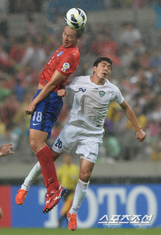 11일 오후 서울월드컵구장에서 2014브라질월드컵 최종예선 한국과 우즈베키스탄의 경기가 열렸다. 한국 김신욱이 우즈벡 투크타쿠야에프와 헤딩볼을 다투고 있다. 상암=허상욱 기자 wook@sportschosun.com / 2013.06.11.