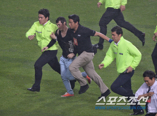 11일 오후 서울월드컵구장에서 2014브라질월드컵 최종예선 한국과 우즈베키스탄의 경기가 열렸다. 후반 직전 경기장에 난입한 우즈벡 팬이 관리요원들에게 끌려 나가는 사건이 벌어졌다.