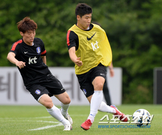 이란과의 브라질월드컵 아시아지역 최종예선 8차전을 앞둔 A대표팀이 13일 파주 축구트레이닝센터에서 훈련을 가졌다. 미니게임 중 이근호가 김보경의 수비를 피해 돌파를 시도하고 있다. 파주=허상욱 기자 wook@sportschosun.com/2013.06.13/