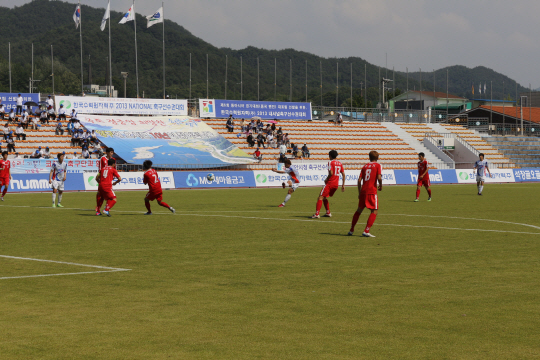 ◇14일 강원도 양구 A경기장에서 펼쳐진 인천코레일과 천안시청의 2013년 한국수력원자력 내셔널축구선수권대회 결승전에서 후반 5분 김형운이 3번째 골을 터뜨리고 있다. 사진제공=내셔널리그