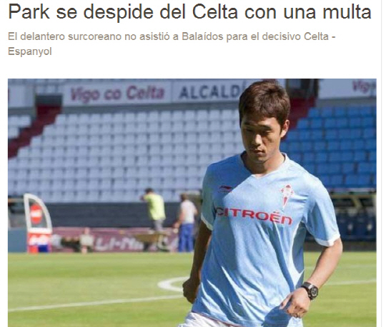 스페인어권 인터넷매체인 테라는 17일(한국시각) '박주영이 셀타비고와의 작별을 앞두고 벌금을 물었다'고 전했다. 이 매체는 박주영이 에스파뇰과의 2012~2013시즌 프리메라리가 최종전에 불참한 것이 이유가 됐다고 덧붙였다. 박주영은 당시 부상으로 출전 명단에서 제외됐다. 팀 규정상 경기장을 방문해 경기를 지켜봐야 하지만, 박주영은 에스파뇰전이 펼쳐졌던 발라이도스 스타디움에 모습을 드러내지 않은 것으로 알려졌다. 테라는 '셀타비고가 잔류 확정 뒤 선수단에 일괄적으로 보너스를 지급했으나, 박주영은 무단 불참에 의한 벌금으로 보너스 지급액이 대폭 삭감됐다'고 보도했다.