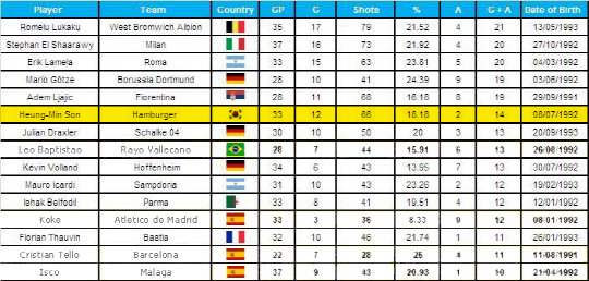 1위엔 17골4도움으로 잉글랜드 프리미어리그에서 벨기에 돌풍을 일으킨 로멜루 루카쿠(웨스트브롬)가 랭크됐다.