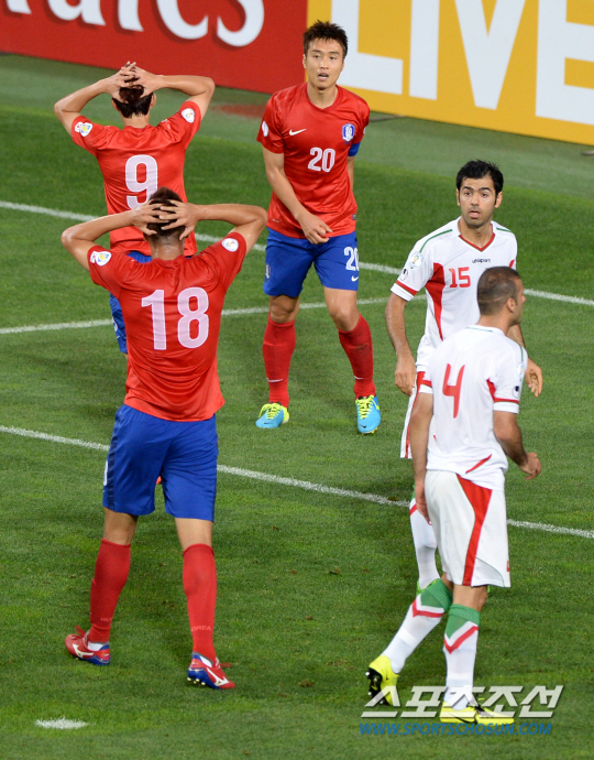 한국은 초반부터 이란 진영에서 일방적인 공격을 퍼부었다. 이란은 레자 구차네자드(리에주)를 원톱으로 내세웠으나, 나머지 선수들이 대부분 진영을 지키며 수비에 집중했다. 전반 6분 김신욱의 슛으로 포문을 연 한국은 6분 뒤 이동국이 아크 오른쪽에서 왼발 중거리슛을 시도했으나, 골키퍼에 막혀 선제골을 얻지 못했다. 전반 22분과 25분엔 이명주와 김영권의 슛이 이어졌으나, 골문을 외면했다.