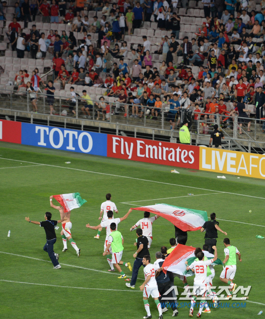 브라질월드컵 아시아지역 최종예선 A조 8차전 한국과 이란의 경기가 18일 울산 문수월드컵경기장에서 열렸다. 1대0으로 승리하며 본서진출을 확정한 이란 선수들이 그라운드를 돌고 있다. 관중석의 팬들이 그라운드를 향해 물병을 던지고 있다. 울산=허상욱 기자 wook@sportschosun.com/2013.06.18/
