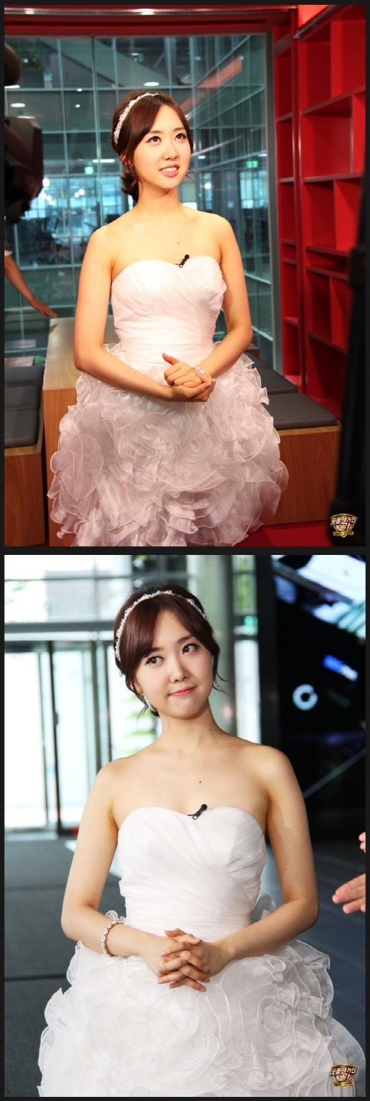 머리에 티아라 장식을 한 김 아나운서는 가슴 선이 훤희 드러나는 탱크톱 형 드레스를 입고 마치 예비 신부의 모습을 뽐내고 있다.