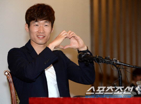 박지성이 20일 수원월드컵경기장 컨벤션홀에서 열애설과 결혼에 대해 자신의 공식입장을 밟히는 기자회견을 가졌다. 질문에 답하던 박지성이 김민지 아나운서를 향해 하트를 그려보이고 있다. 수원=허상욱 기자 wook@sportschosun.com/2013.06.20/