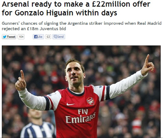 20일(한국시각) 영국 일간지 데일리미러는 아스널은 이과인과 에이전트인 이과인 아버지를 만나 이적료와 주급 등에 관해서 협상을 마쳤다고 보도했다. 이과인의 이적료는 2200만파운드로 추정되며 이는 역대 아스널 신기록이다. 주급 역시 13만파운드에 이른다. 이는 그간 철옹성처럼 유지해 온 아스널의 주급체계를 깨뜨리는 금액이다. 정말 아스널이 올여름 돈보따리를 풀긴 풀 작정인가 보다.