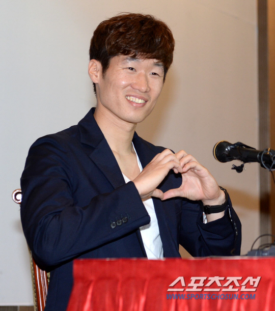 박지성이 20일 수원월드컵경기장 컨벤션홀에서 열애설과 결혼에 대해 자신의 공식입장을 밝히는 기자회견을 가졌다. 질문에 답하던 박지성이 김민지 아나운서를 향해 하트를 그려보이고 있다. 수원=허상욱 기자 wook@sportschosun.com/2013.06.20/
