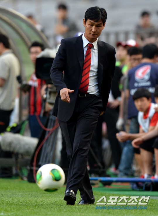 FC서울과 부산 아이파크의 K리그 클래식 2013 14라운드 경기가 23일 서울월드컵경기장에서 열렸다. 서울 최용수 감독이 아웃된 볼이 자신을 향해 오자 발로 차내고 있다. 상암=허상욱 기자 wook@sportschosun.com/2013.06.23/