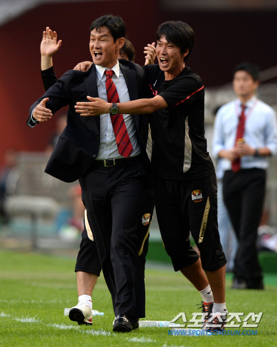 FC서울과 부산 아이파크의 K리그 클래식 2013 14라운드 경기가 23일 서울월드컵경기장에서 열렸다. 후반 서울 최용수 감독이 에스쿠데로의 선제골이 터지자 기뻐하고 있다. 상암=허상욱 기자 wook@sportschosun.com/2013.06.23/