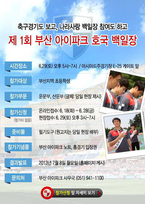 '제1회 부산 아이파크 호국 백일장'에 참가를 희망하는 가족은 인터넷 홈페이지(www.busanipark.com)을 통해 신청 접수 가능하다. 경기 당일 아시아드경기장 입장 게이트 앞에서 현장 접수도 가능하다. 또한 백일장 참가자 전원에게는 구단에서 제공하는 특별 기념품이 제공될 예정이다.
