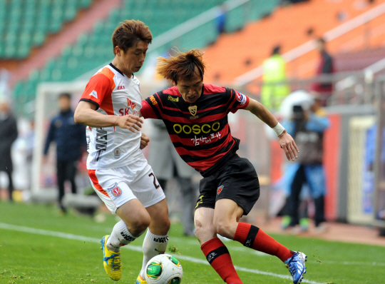 | ◇노병준(오른쪽)이 지난 4월 20일 포항스틸야드에서 열린 제주와의 2013년 K-리그 클래식 경기에서 수비수를 제치는 모습. 사진제공=포항 스틸러스 |