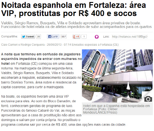 스페인 선수단이 국제축구연맹(FIFA) 컨페더레이션스컵이 열리는 브라질 현지에서 윤락 행위를 한 것으로 전해져 논란이 일고 있다. 브라질 스포츠지 란세는 27일(한국시각) '빅토르 발데스와 세르히오 라모스, 세르히오 부스케스, 다비드 비야가 숙소에 윤락 여성을 데리고 왔다'고 전했다. 이 신문에 따르면 이들은 나이지리아와의 조별리그 최종전에서 3대0으로 승리한 직후 포르탈레자 시내로 나가 이튿날 새벽 현지 여성들과 함께 호텔 진입을 시도했다. 동행한 여성들은 1인당 400헤알(약 21만원) 씩의 화대를 받은 윤락 여성들이었다. 선수들은 호텔 직원이 여성 출입을 불허하자, 객실로 돌아가 TV리모컨과 비누를 창문으로 던지며 불만을 표출했다. 이에 대해 스페인 현지 언론들은 브라질 언론들이 스페인 대표팀을 흔들고 있다는 부정적인 시각을 드러내고 있다. 스페인 대표팀도 이번 사태에 대해 공식 입장을 내놓지 않고 있다.