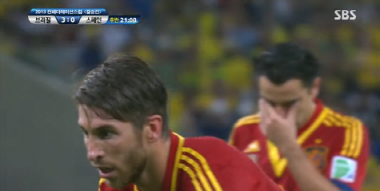 스페인 대표팀의 베테랑 수비수 세르히오 라모스(레알 마드리드)가 브라질전 페널티킥 실축 장면에서 나온 사비 에르난데스(바르셀로나)의 표정이 웃음을 자아내고 있다.