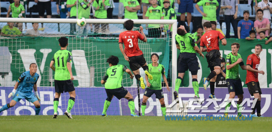 '봉동이장' 최강희 감독이 복귀한 전북현대가 30일 전주월드컵경기장에서 경남FC와 경기를 벌였다. 전북 문전에서 아찔한 헤딩 공방전이 벌어지고 있다. 전주=정재근 기자 cjg@sportschosun.com/2013.06.30/ |