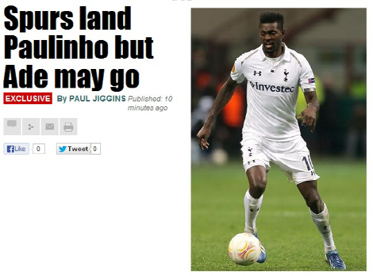 토트넘은 솔다도 영입을 위해 1500만파운드를 준비했지만, 발렌시아 측은 최소 2500만파운드를 원하고 있다. 아마데오 살보 릴로 발렌시아 회장은 "우리는 재정적인 어려움을 겪고 있다. 하지만 절대 헐값에 선수를 팔지는 않을 것이다"고 했다. 그러나 이적료보다 더 먼저 해결해야 할 문제가 있다. 바로 '계륵'으로 전락한 에마누엘 아데바요르의 방출이다. 2일(한국시각) 영국 일간지 더선은 토트넘이 주급 8만파운드를 받고 있는 아데바요르를 팔아야 솔다도를 영입할 수 있다고 보도했다. 토트넘의 현 주급체계를 유지하기 위해서는 고액 주급 수령자를 방출해야 한다. 현재 베식타슈가 500만파운드에 아데바요르 영입을 노리고 있는 것으로 알려졌다.