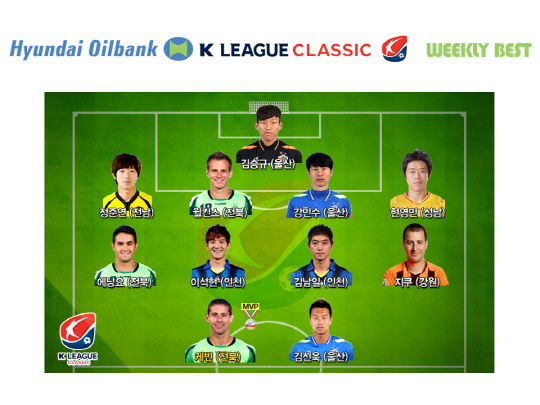 케빈과 함께 15라운드 최고의 공격수로는 김신욱(울산)이 꼽혔다. 전반 48초만에 선제골을 넣은 김신욱은 FC서울전 2대0 승리의 발판을 마련했다. 최고의 미드필드에는 지쿠(강원) 김남일 이석현(이상 인천) 에닝요(전북)가 자리했고, 포백 라인은 현영민(성남) 강민수(울산) 윌킨스(전북) 정준연(전남)이 차지했다. 최고의 수문장 자리는 울산의 골키퍼 김승규에게 돌아갔다.