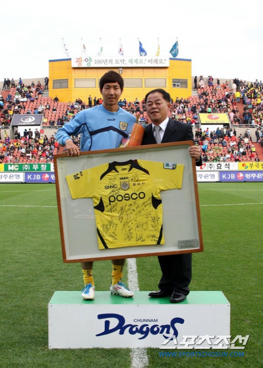 ◇황도연은 2011년 9월 25일 성남전에서 프로 데뷔골을 기록했다. 프로 데뷔골 시상식 직후 유종호 전남 드래곤즈 사장(오른쪽)과 함께 포즈를 취한 황도연. 전남유스 출신의 황도연이 17세 대표팀 시절 은사인 박경훈 감독의 제주에서 새로운 도전을 시작한다.