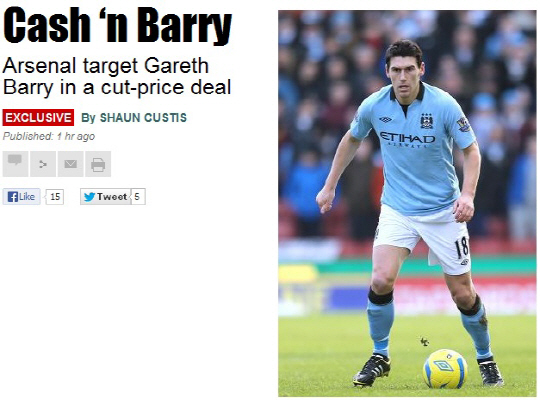 3일(한국시각) 영국 일간지 더선은 아스널이 맨시티의 중앙 미드필더 가레스 배리 영입을 노리고 있다고 보도했다. 10만 파운드의 주급을 받는 배리는 맨시티와의 계약기간이 1년 밖에 남지 않았다. 아스널은 32세의 배리에게 저정도 규모의 주급을 맞춰줄 수가 없다. 대신 계약기간을 늘려 배리를 유혹한다는 계획이다.