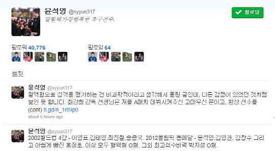 윤석영은 3일 최강희 A대표팀 감독의 '혈액형 발언'에 대한 생각을 트위터에 올렸다. "O형의 경우 성격은 좋지만 덜렁거리고 종종 집중력을 잃어, 경기전에 많은 얘기를 나눠야 한다"라는 발언에 윤석영이 트위터에 혈액형이 O형인 수비수 이름을 열거했다. '2002년 태극전사 수비수 대부분이 O형'이라는 것이 요지였다.