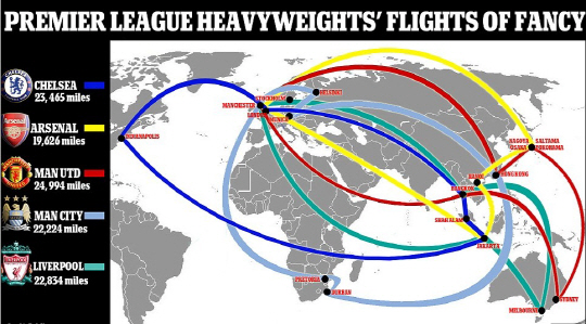 그 규모가 더욱 확대됐다. 3일(한국시각) 영국 일간지 데일리메일에 따르면 지난해 20개 클럽이 전 세계를 누빈 거리는 18만6016마일(29만9363km)이었다. 올시즌에는 이보다 늘어난 19만9701마일(32만1387km)이 예정돼 있다. 올여름 가장 바쁜 EPL 클럽은 맨유다. 맨유의 올여름 예상 이동거리는 무려 2만4994마일(4만223km)에 달한다. 태국 방콕을 시작으로 호주 시드니, 일본 요코하마, 홍콩까지 아시아투어가 예정돼 있다. 맨체스터로 돌아온 뒤에도 스웨덴 스톡홀름 투어가 잡혀있다. 조제 무리뉴 감독이 새롭게 지휘봉을 잡은 첼시도 아시아투어를 떠난다. 방콕, 말레이시아 쿠알라룸푸르, 인도네시아 자카르타에서 경기를 치른 후 숨돌릴틈도 없이 미국투어를 떠날 예정이다. 이동거리는 2만3465마일(3만7763km)이나 된다. 리버풀과 맨시티도 빡빡한 여행계획을 잡았다.