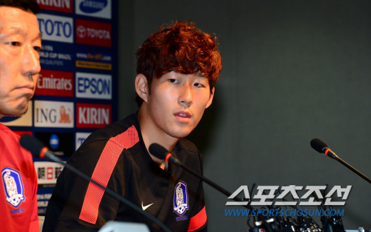최강희호가 10일 상암동 서울월드컵 경기장에서 11일 열리는 2014년 브라질월드컵 아시아 최종예선 7차전 우즈베키스탄과 경기를 앞두고 막바지 훈련에 임했다. 훈련 전 기자회견을 하고 있는 최강희 감독과 손흥민. 상암동=송정헌 기자 songs@sportschosun.com/2013.6.10 |
