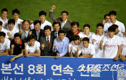 브라질월드컵 아시아지역 최종예선 A조 8차전 한국과 이란의 경기가 18일 울산 문수월드컵경기장에서 열렸다. 8회연속 월드컵 본선진출을 축하하는 기념행사가 그라운드에서 펼쳐지고 있다. 정몽규 대한축구협회장, 최강희 감독, 월드컵 레전드와 선수들이 기념촬영을 하고 있다. 울산=허상욱 기자 wook@sportschosun.com/2013.06.18/