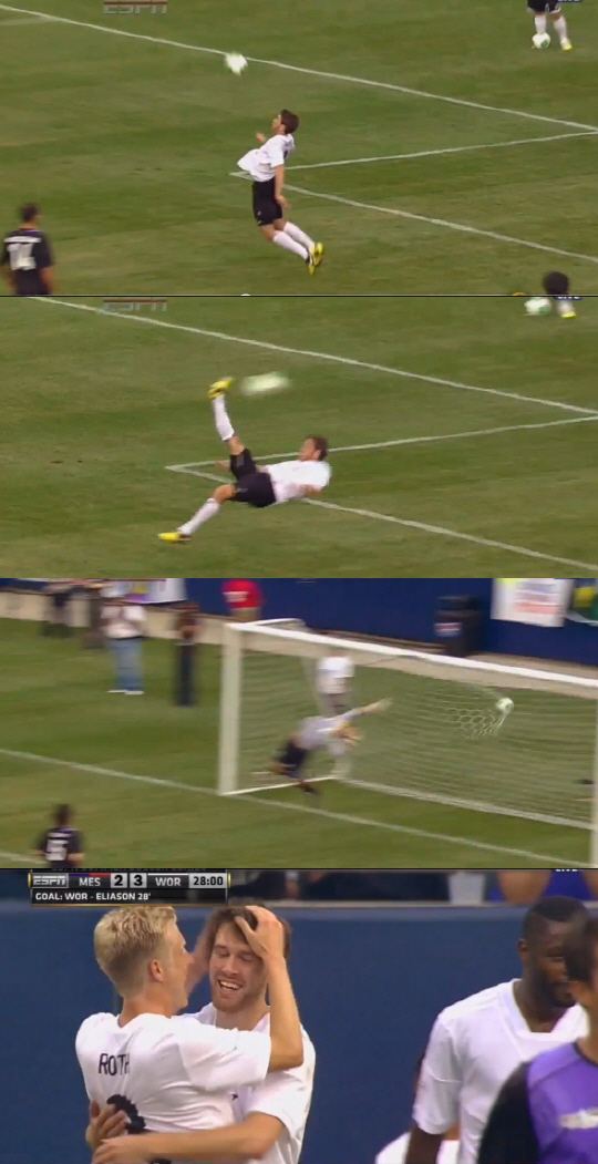 세계 올스타팀에 소속된 엘리어슨은 2-2로 맞선 전반 27분 앙리의 패스를 받아 멋진 오버헤드킥으로 연결했다.
