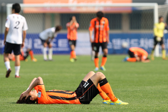 | 12일 오후 강릉종합경기장에서 '현대오일뱅크 K리그 2013' 11라운드 강원FC와 성남 일화의 경기에서, 성남을 상대로 시즌 첫 승을 신고한 강원FC 선수들이 경기 종료 후 그라운드에 누워 승리를 만끽하고 있다. 강원이 성남을 2-1로 물리쳤다.(사진=강원FC 제공) |