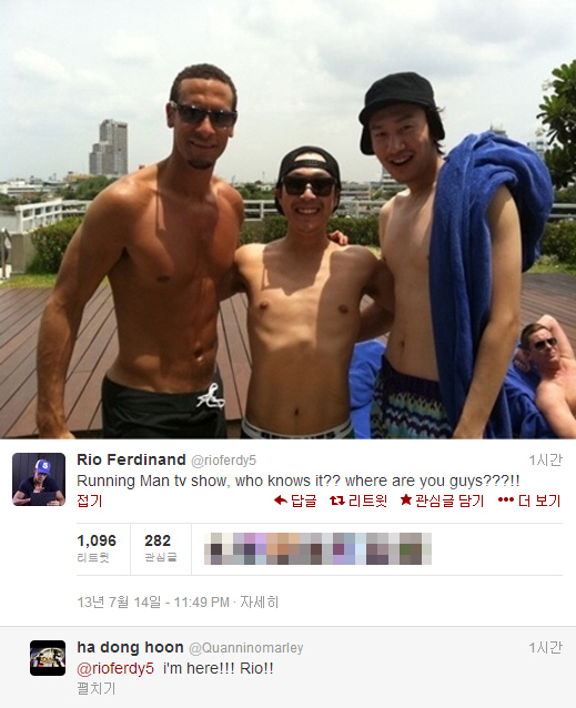 아시아 투어 중인 맨체스터 유나이티드의 수비수 리오 퍼디낸드가 트위터에 SBS 인기 예능 '런닝맨'을 언급했다.