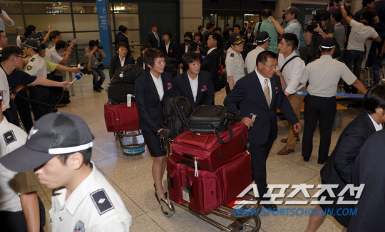 북한 선수단은 단 5분 만에 공항 건물을 빠져 나갔다. 오후 10시53분 맨 처음 모습을 드러낸 임원진이 허 부회장, 안 전무와 간단한 인사를 나눈 뒤 공항경비대의 안내를 받으며 걸음을 옮겼다. 선수들도 수많은 취재진 앞에 다소 놀란 듯 빠르게 걸음을 옮기며 준비된 버스로 이동했다. 다소 경직됐을 법한 모습을 상상했으나, 의외로 표정은 밝았다. 취재경쟁이 신기한 듯 바라보는 선수와 임원도 보였다. 선수단이 이동하는 과정에서 경찰과 취재진 사이에 실랑이가 벌어지는 모습도 간간이 눈에 띄었다. 동선이 무너지면서 북한 선수단이 버스 앞에 무인지경의 상황에 놓이는 듯 했으나, 경찰 병력이 잽싸게 애워싸면서 상황이 정리됐다. 북한 선수단은 버스 내에서 인원 확인 등을 한 뒤 숙소로 출발했다.