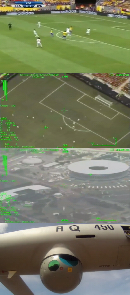 당시 브라질 공군은 경기가 열린 브라질리아 마네 가힌샤 스타디움 상공에 9시간 동안 무인정찰기를 띄워 개막전 경호에 대비했는데, 마침 네이마르의 골장면이 촬영된 것이다.