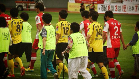 세상의 모든 그라운드엔 스토리가 있다. 스코어, 그 이상의 감동이 있다. 이날도 그랬다. 부산이 첫시도한 실버 에스코트, 할머니들이 손자뻘 선수들의 손을 잡고 입장하는 훈훈한 그림 사이로, 의미있는 한 장면이 목격됐다. '적'으로 만난 전남의 김영욱(22)과 부산의 박준강(22)이 손을 꼭 맞잡았다. 이들의 친구이자 열혈서포터인 김가림양(22)이 장면을 놓치지 않았다. 셔터를 눌렀다. 김영욱과 박준강, 굳게 맞잡은 손엔 '10년 절친의 약속'이 숨어 있었다.