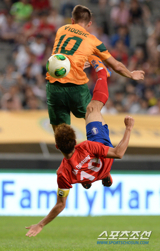 2013 동아시안컵 축구 한국과 호주의 경기가 20일 서울월드컵경기장에서 열렸다. 하대성이 호주 자코비치와 비도시치의 수비를 피해 오버헤드킥을 날리고 있다. 상암=허상욱 기자 wook@sportschosun.com