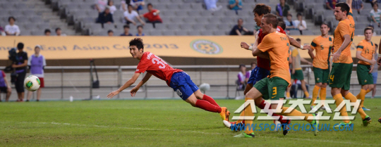 20일 오후 서울 상암월드컵구장에서 2013 동아시아컵 한국과 호주의 경기가 열렸다. 한국 김동섭이 호주 골문을 향해 헤딩슛을 시도하고 있다. 상암= 김경민 기자 kyungmin@sportschosun.com / 2013.07.20.