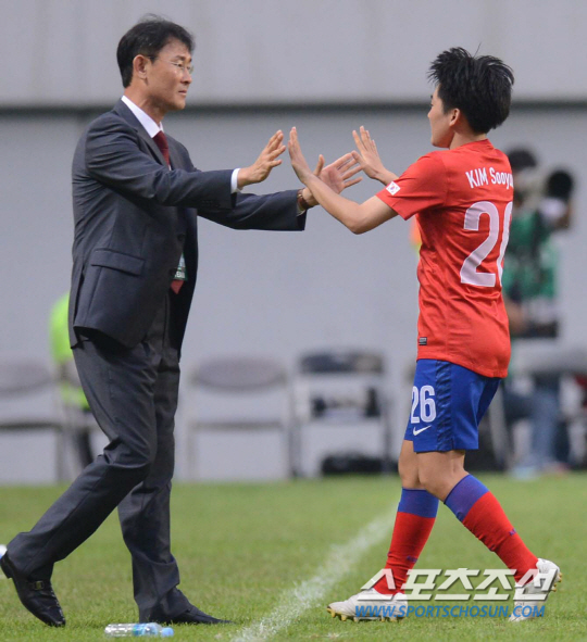◇윤덕여 여자 대표팀 감독이 21일 서울월드컵경기장에서 가진 북한과의 2013년 여자 동아시안컵 첫 경기에서 첫 골을 성공시킨 김수연과 하이파이브 하고 있다. 상암=최문영 기자 deer@sportschosun.com