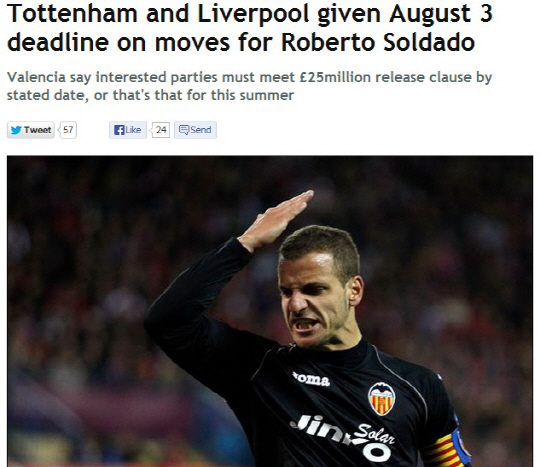토트넘과 리버풀은 공격진 보강을 위해 발렌시아의 스트라이커 솔다도를 노리고 있다. 22일(한국시각) 영국 일간지 데일리미러는 아마데오 살보 발렌시아 회장이 2500만파운드를 제시하는 클럽에게 솔다도를 팔 것이라고 했다고 보도했다. 2500만파운드는 솔다도의 바이아웃 금액이다. 하지만 마감시한이 있다. 살보 회장은 8월 3일까지라고 못박았다. 이때가 아니면 솔다도 영입은 불가하다고 했다.