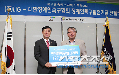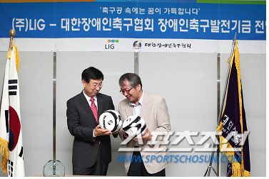 대한장애인축구협회는 2007년 창립된 이후 뇌성, 시각, 청각, 지적 장애인 단체별 축구를 조직적으로 발전시켜왔으며 체육활동을 통한 장애인들의 적극적인 사회 참여는 물론 일반인들의 장애인 스포츠에 대한 인식을 개선하는데 앞장서 왔다. LIG그룹은 2007년부터 장애인축구협회 후원 및 친선경기를 통해 인연을 맺어왔다. 2012년 구본상 부회장이 2대 협회장에 취임하면서 더욱 밀접한 관계를 이어가고 있다. 대한장애인축구협회의 '축구공 속에는 꿈이 가득하다'는 슬로건에 동참하고 적극적인 교류를 통해 기업의 사회적 책임과 의무를 다하고 있다. 전국장애인축구선수권대회 후원은 물론 네덜란드에서 열린 뇌성마비장애인축구 세계선수권대회 지원하는 등 지속적인 후원을 진행해왔다. 전영지 기자 sky4us@sportschosun.com